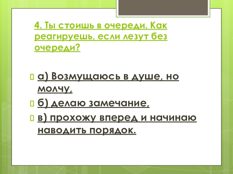 Слайд 134. Ты стоишь в очереди. Как реагируешь, если лезут без очереди?
