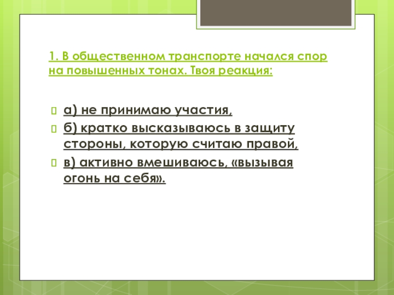 Слайд 101. В общественном транспорте начался спор на повышенных тонах. Твоя реакция: