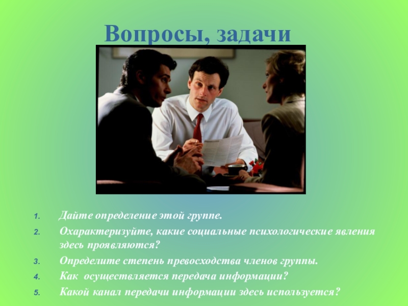 Вопросы, задачиДайте определение этой группе.Охарактеризуйте, какие социальные психологические явления здесь проявляются?Определите степень превосходства членов группы.Как
