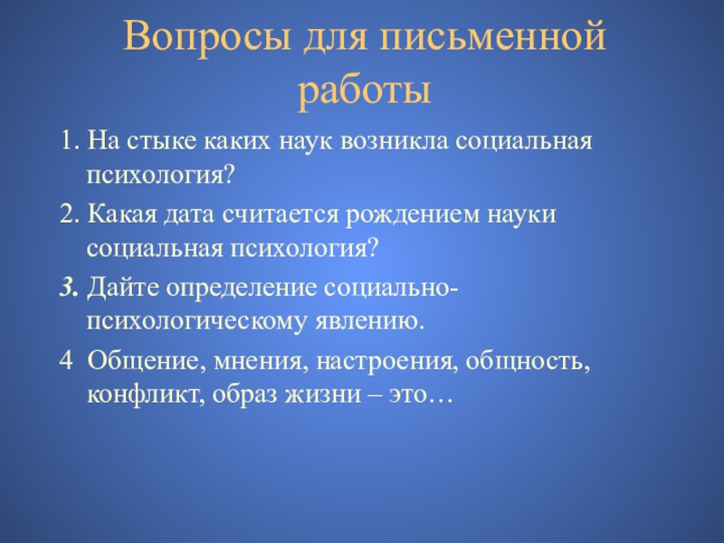 Вопросы для письменной работы1. На стыке каких наук возникла социальная психология? 2. Какая дата считается рождением науки