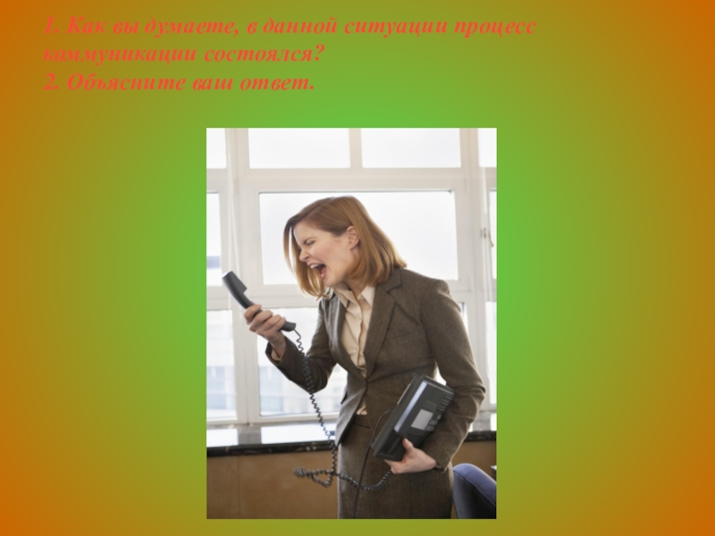 Слайд 10 1. Как вы думаете, в данной ситуации процесс коммуникации состоялся? 2. Объясните