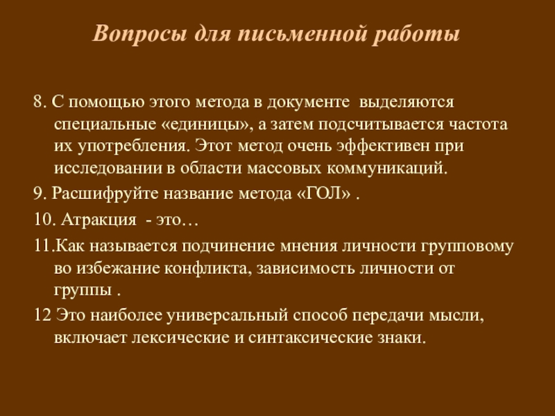 Слайд 12Вопросы для письменной работы