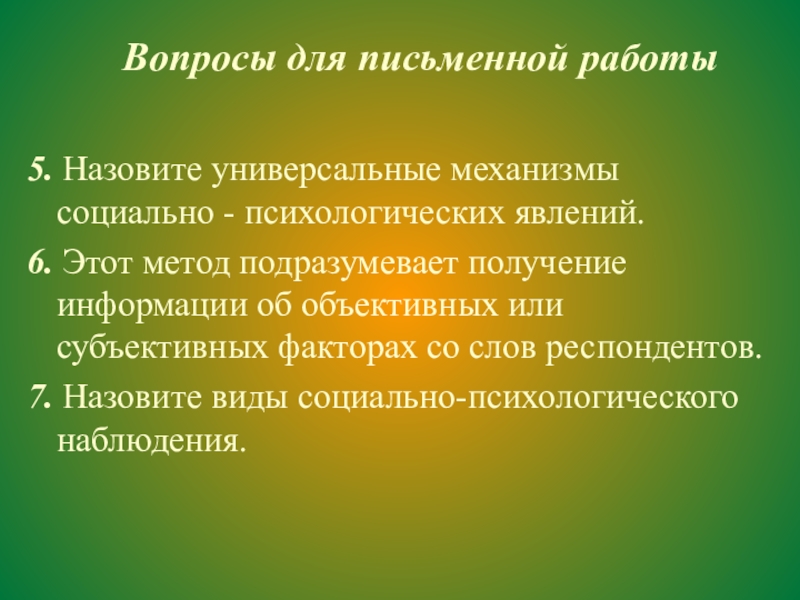 Вопросы для письменной работы5. Назовите универсальные механизмы социально - психологических явлений. 6. Этот метод подразумевает получение информации