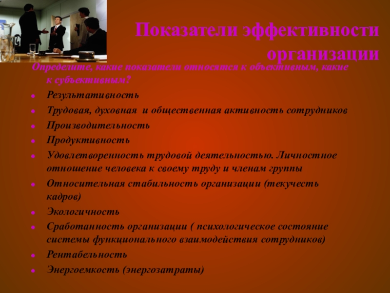 Показатели эффективности организацииОпределите, какие показатели относятся к объективным, какие к субъективным?РезультативностьТрудовая, духовная и общественная активность сотрудниковПроизводительностьПродуктивность Удовлетворенность трудовой деятельностью. Личностное отношение человека к своему труду и членам группыОтносительная стабильность организации (текучесть кадров) Экологичность Сработанность организации (