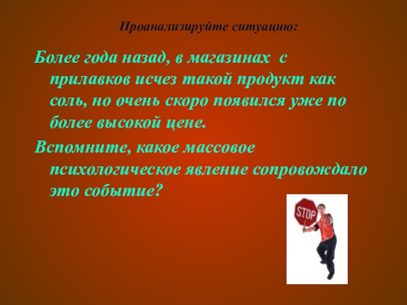 Проанализируйте ситуацию:Более года назад, в магазинах с прилавков исчез такой продукт как соль, но очень скоро появился