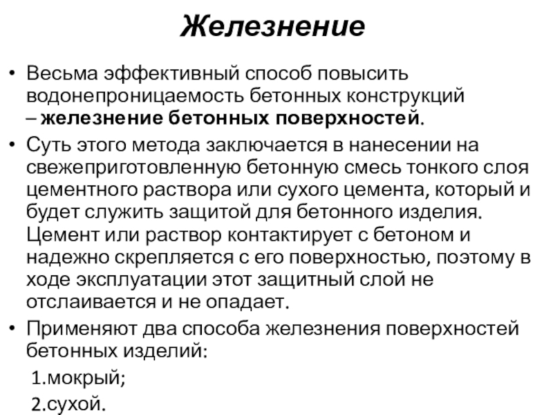 Весьма эффективный способ повысить водонепроницаемость бетонных конструкций – железнение бетонных поверхностей.