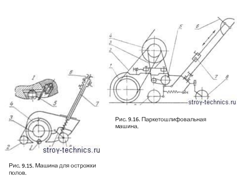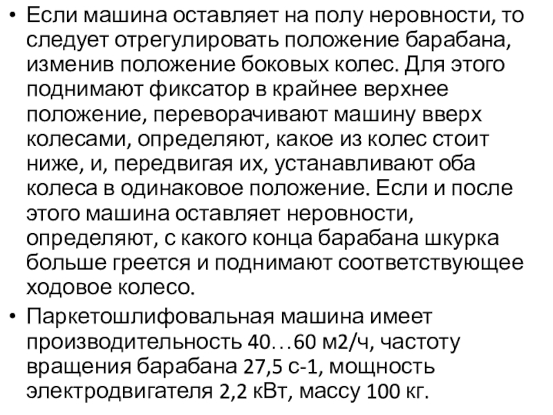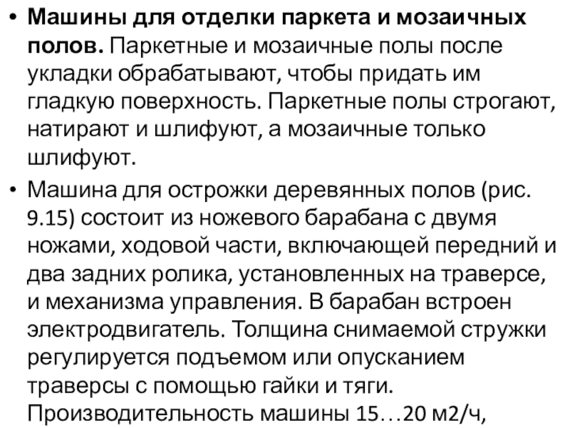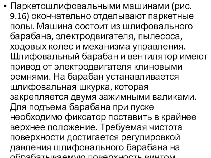 Слайд 35Паркетошлифовальными машинами (рис. 9.16) окончательно отделывают паркетные полы. Машина состоит из