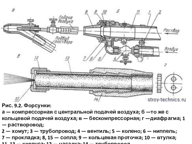 (рис. 9.1) состоит из растворосмесителя, вибросита с бункером и растворонасоса, смонтированных на прицепе. Агрегат предназначен для приемки и переработки раствора, привезенного с растворного узла, а также для транспортирования его на рабочие места и нанесения на обрабатываемую поверхность, для чего он комплектуется раствороводами и форсункой. Применяют два типа форсунок: механические (бескомпрессорные), работающие за счет давления, развиваемого растворонасосом, и пневматического действия (рис. 9.2).