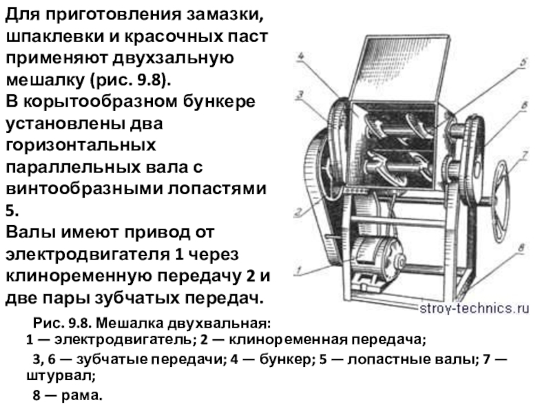 Для приготовления замазки, шпаклевки и красочных паст применяют двухзальную мешалку (рис. 9.8).