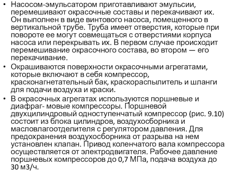 Слайд 23Насосом-эмульсатором приготавливают эмульсии, перемешивают окрасочные составы и перекачивают их. Он выполнен
