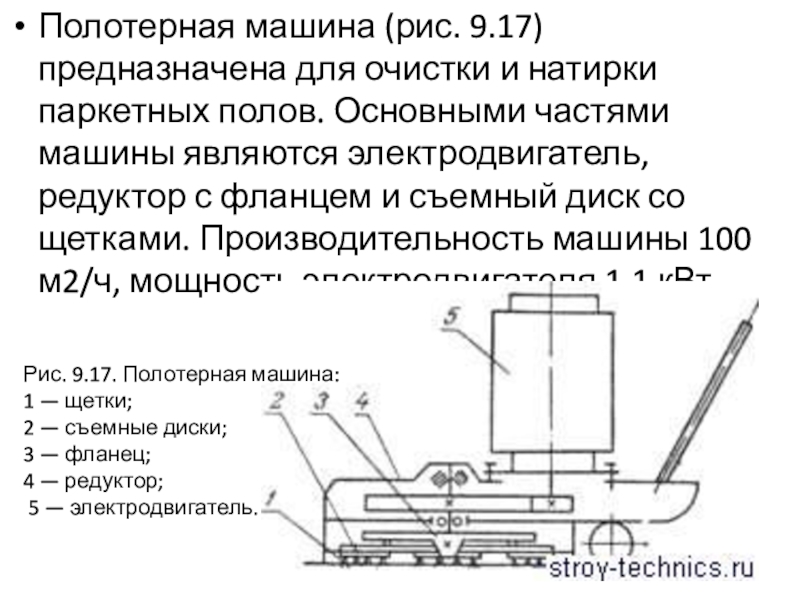 Слайд 37Полотерная машина (рис. 9.17) предназначена для очистки и натирки паркетных полов.