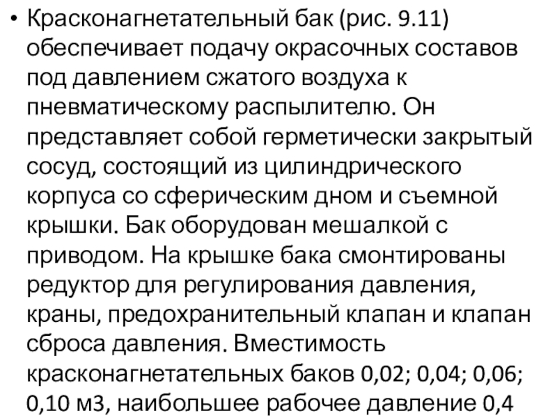 Слайд 26Красконагнетательный бак (рис. 9.11) обеспечивает подачу окрасочных составов под давлением сжатого