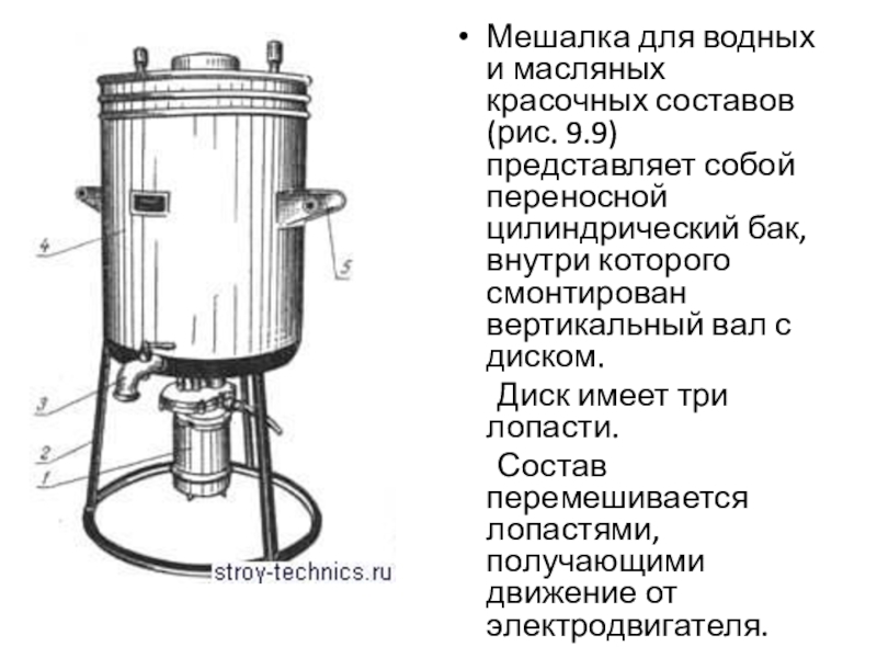 Слайд 22Мешалка для водных и масляных красочных составов (рис. 9.9) представляет собой