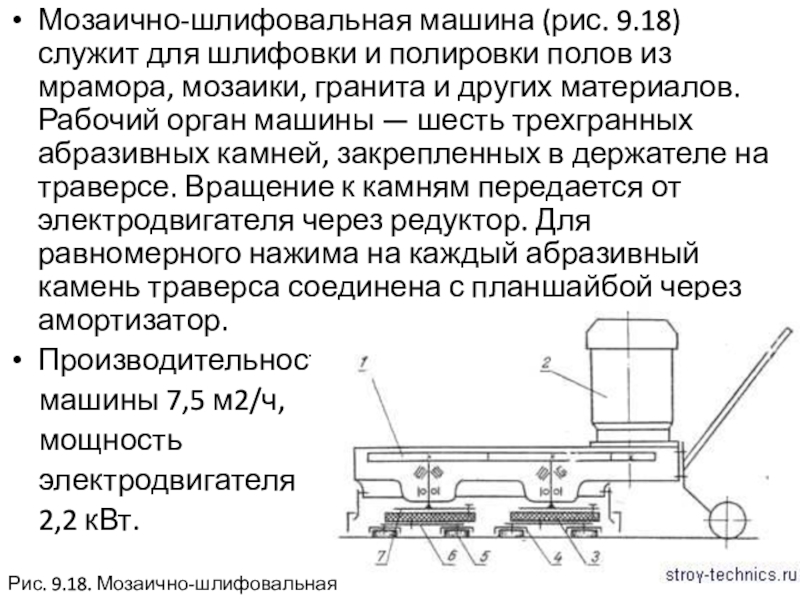 Слайд 38Мозаично-шлифовальная машина (рис. 9.18) служит для шлифовки и полировки полов из