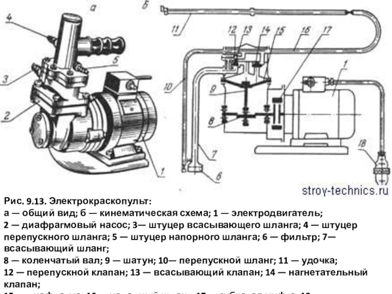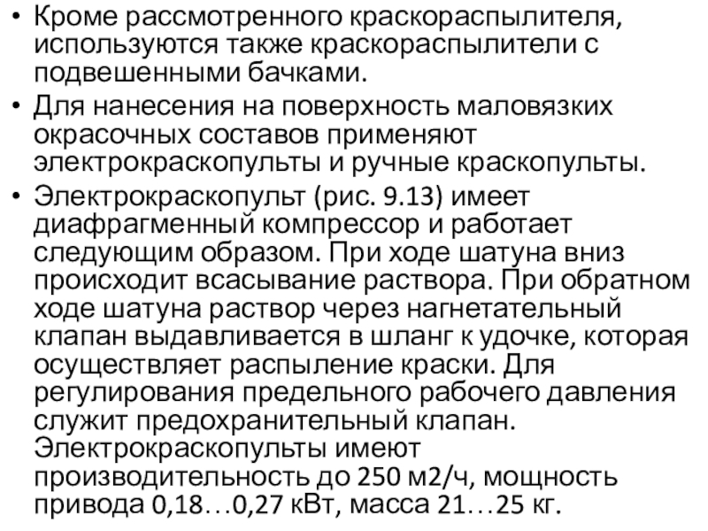 Электрокраскопульт (рис. 9.13) имеет диафрагменный компрессор и работает следующим образом. При ходе шатуна вниз происходит всасывание раствора. При обратном ходе шатуна раствор через нагнетательный клапан выдавливается в шланг к удочке, которая осуществляет распыление краски. Для регулирования предельного рабочего давления служит предохранительный клапан. Электрокраскопульты имеют производительность до 250 м2/ч, мощность привода 0,18…0,27 кВт, масса 21…25 кг.
