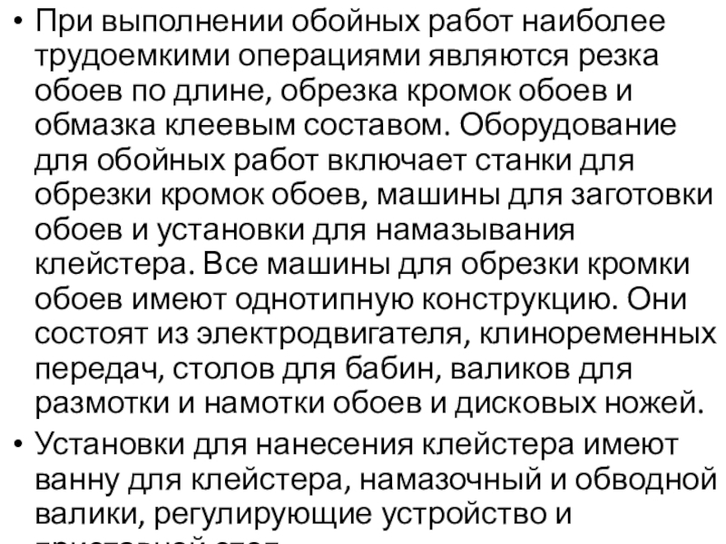 длине, обрезка кромок обоев и обмазка клеевым составом. Оборудование для обойных работ включает станки для обрезки кромок обоев, машины для заготовки обоев и установки для намазывания клейстера. Все машины для обрезки кромки обоев имеют однотипную конструкцию. Они состоят из электродвигателя, клиноременных передач, столов для бабин, валиков для размотки и намотки обоев и дисковых ножей.