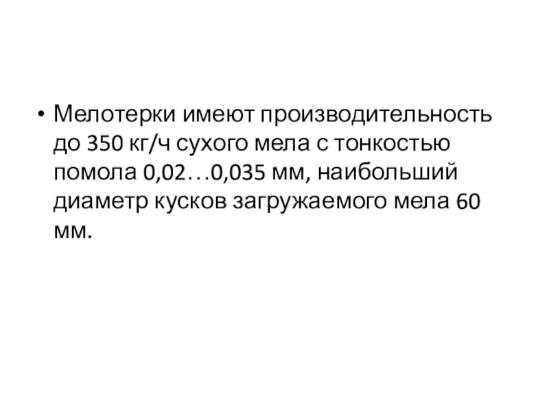 Слайд 19Мелотерки имеют производительность до 350 кг/ч сухого мела с тонкостью помола