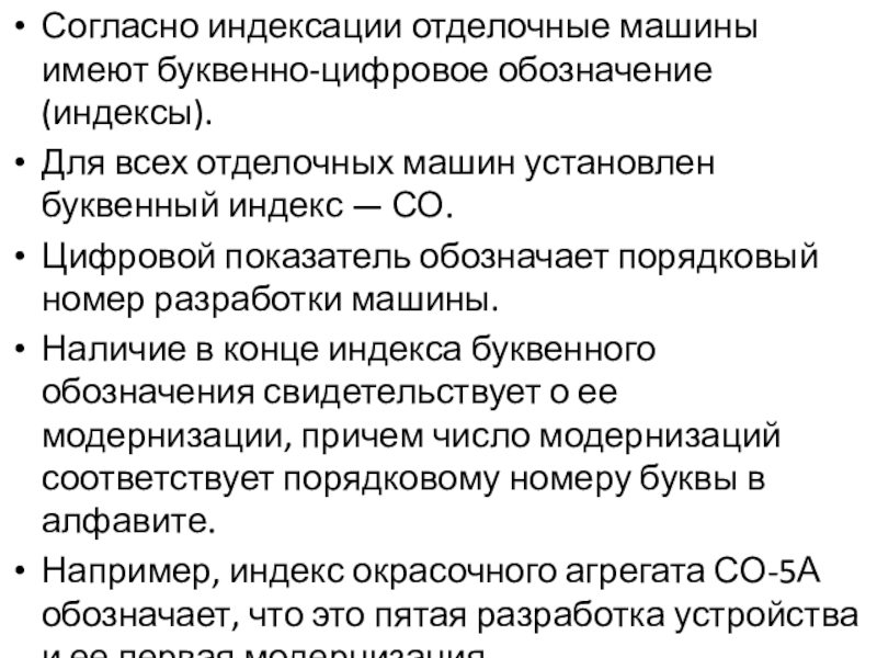Слайд 7Согласно индексации отделочные машины имеют буквенно-цифровое обозначение (индексы).