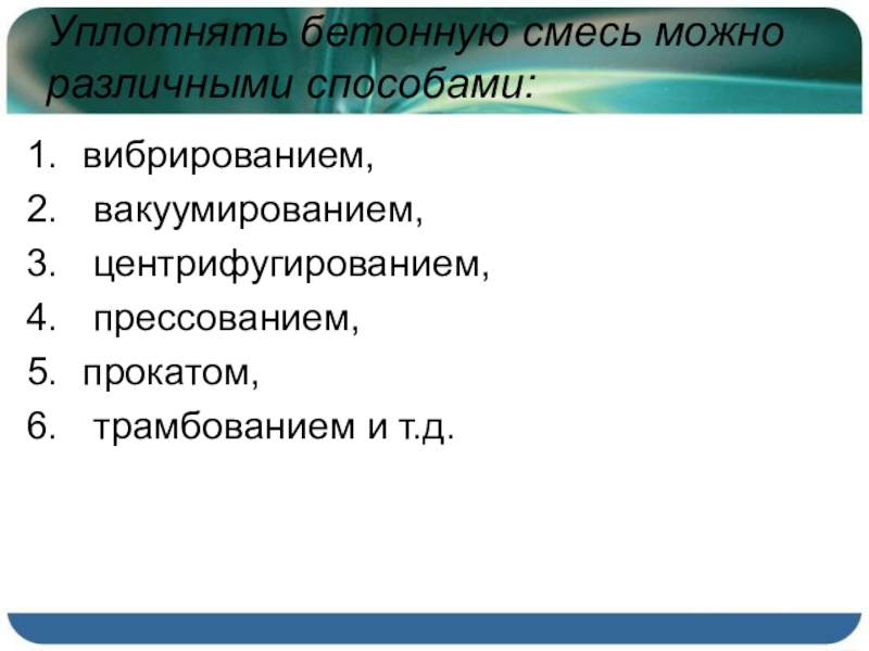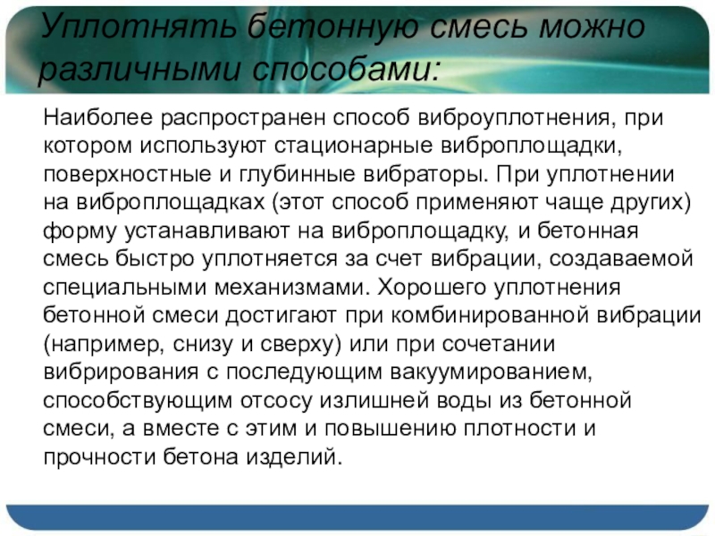 Слайд 16 Наиболее распространен способ виброуплотнения, при котором используют стационарные виброплощадки, поверхностные и