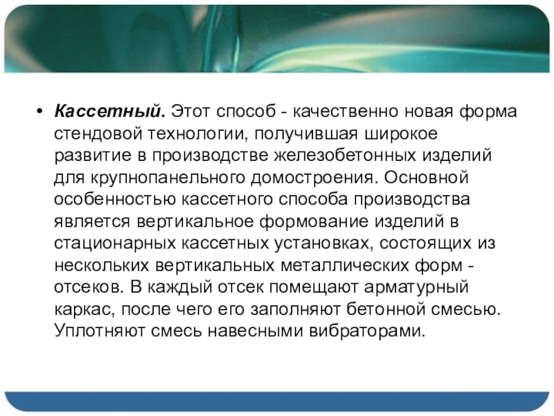 Слайд 26Кассетный. Этот способ - качественно новая форма стендовой технологии, получившая широкое развитие