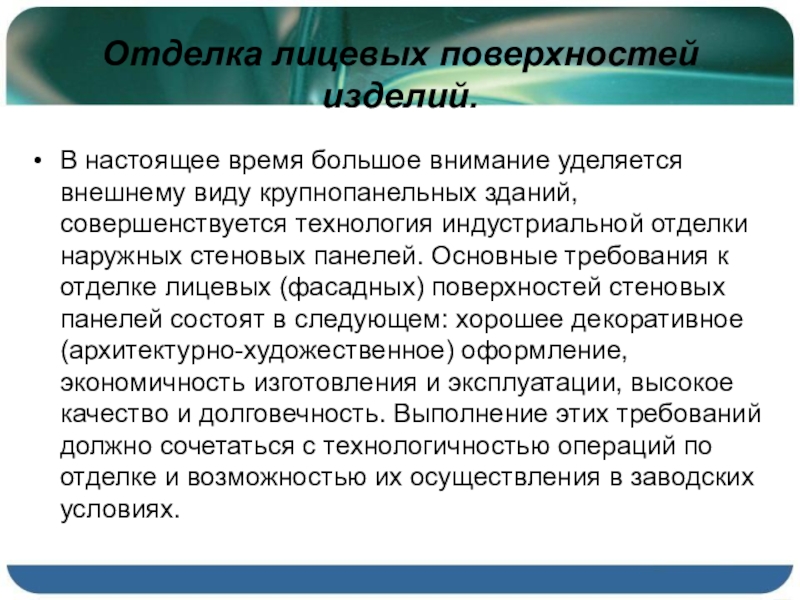 крупнопанельных зданий, совершенствуется технология индустриальной отделки наружных стеновых панелей. Основные требования к отделке лицевых (фасадных) поверхностей стеновых панелей состоят в следующем: хорошее декоративное (архитектурно-художественное) оформление, экономичность изготовления и эксплуатации, высокое качество и долговечность. Выполнение этих требований должно сочетаться с технологичностью операций по отделке и возможностью их осуществления в заводских условиях.