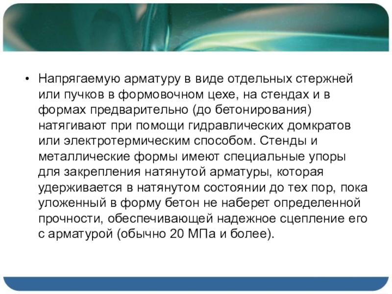 на стендах и в формах предварительно (до бетонирования) натягивают при помощи гидравлических домкратов или электротермическим способом. Стенды и металлические формы имеют специальные упоры для закрепления натянутой арматуры, которая удерживается в натянутом состоянии до тех пор, пока уложенный в форму бетон не наберет определенной прочности, обеспечивающей надежное сцепление его с арматурой (обычно 20 МПа и более).