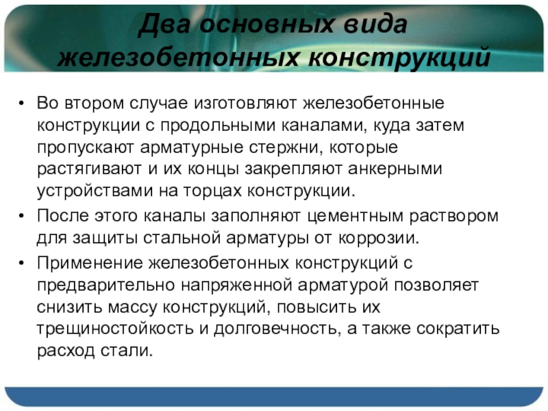 Применение железобетонных конструкций с предварительно напряженной арматурой позволяет снизить массу конструкций, повысить их трещиностойкость и долговечность, а также сократить расход стали.