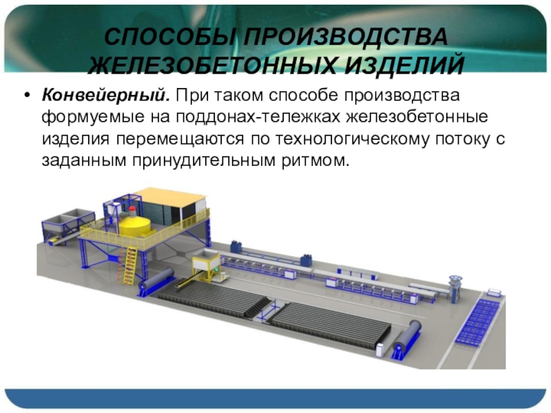 Конвейерный. При таком способе производства формуемые на поддонах-тележках железобетонные