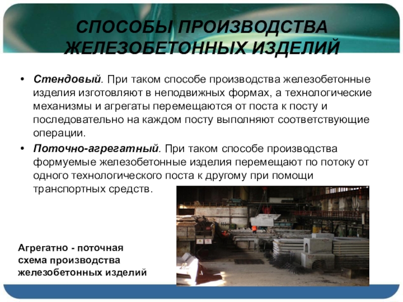Поточно-агрегатный. При таком способе производства формуемые железобетонные изделия перемещают по потоку от одного технологического поста к другому при помощи транспортных средств.