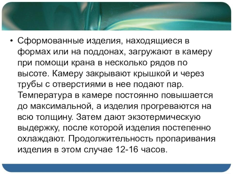 Слайд 20Сформованные изделия, находящиеся в формах или на поддонах, загружают в камеру