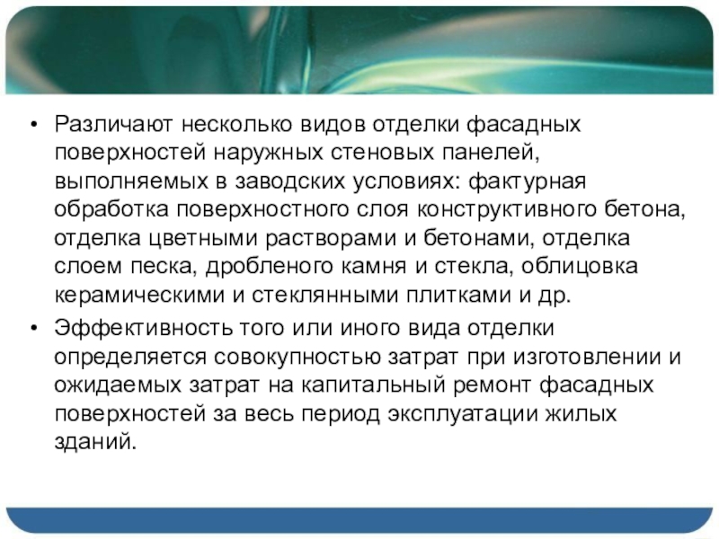 Слайд 22Различают несколько видов отделки фасадных поверхностей наружных стеновых панелей, выполняемых в