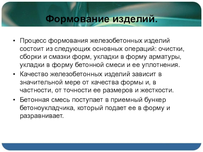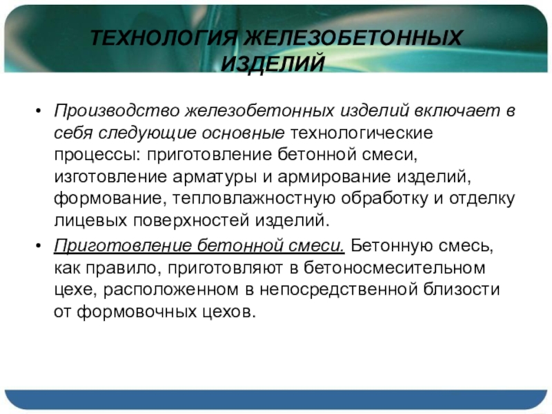 технологические процессы: приготовление бетонной смеси, изготовление арматуры и армирование изделий, формование, тепловлажностную обработку и отделку лицевых поверхностей изделий.