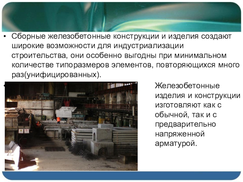 Слайд 6Сборные железобетонные конструкции и изделия создают широкие возможности для индустриализации строительства,