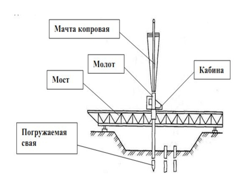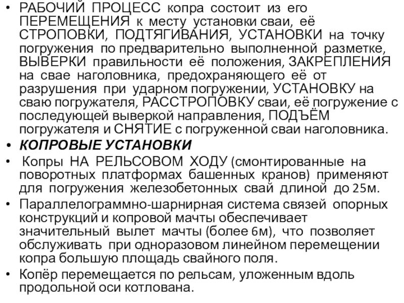 Универсальным БАЗОВЫМ оборудованием для перемещения свай с мест их раскладки к местам погружения, их установки, поддержания и направления, а также для крепления погружателя являются КОПРЫ, обеспечивающие также передвижение сваебойного оборудования вдоль фронта работ.