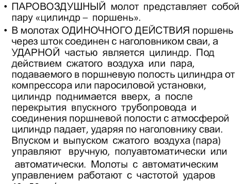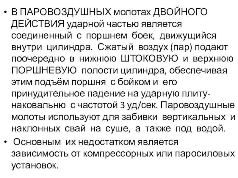 боек, движущийся внутри цилиндра. Сжатый воздух (пар) подают поочередно в нижнюю ШТОКОВУЮ и верхнюю ПОРШНЕВУЮ полости цилиндра, обеспечивая этим подъём поршня с бойком и его принудительное падение на ударную плиту-наковальню с частотой 3 уд/сек. Паровоздушные молоты используют для забивки вертикальных и наклонных свай на суше, а также под водой.