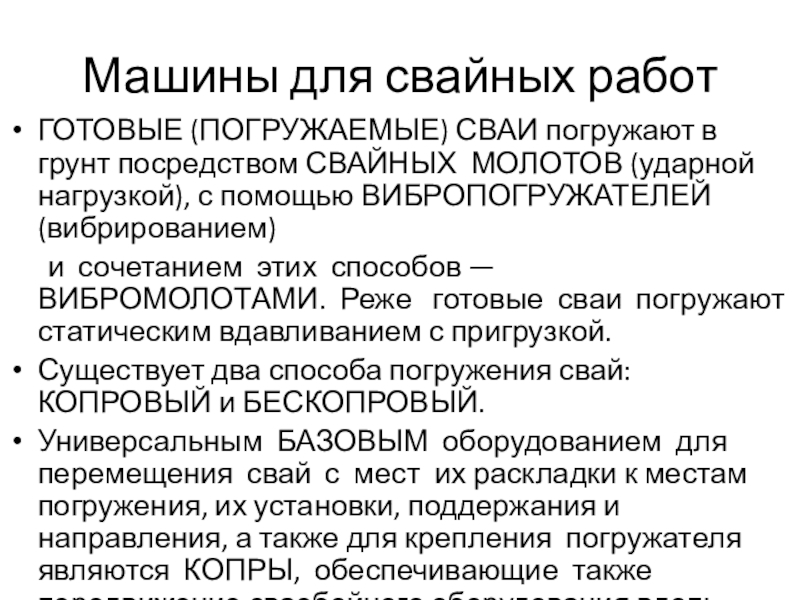 и сочетанием этих способов — ВИБРОМОЛОТАМИ. Реже готовые сваи погружают статическим вдавливанием с пригрузкой.