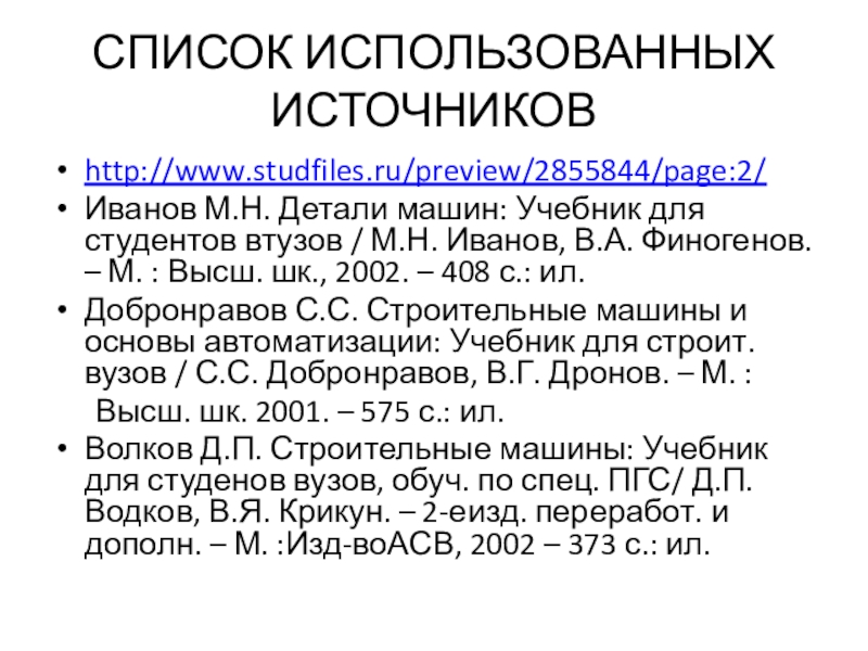 Волков Д.П. Строительные машины: Учебник для студенов вузов, обуч. по спец. ПГС/ Д.П. Водков, В.Я. Крикун. – 2-еизд. переработ. и дополн. – М. :Изд-воАСВ, 2002 – 373 с.: ил.