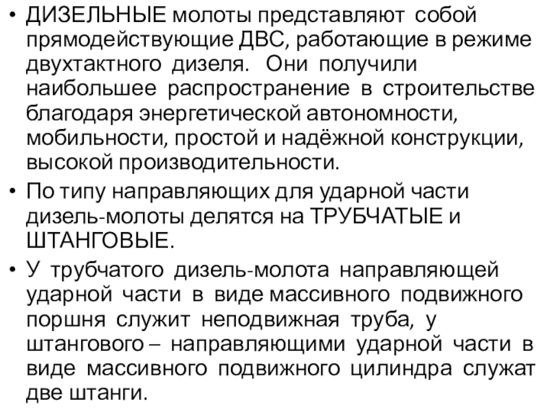Слайд 19ДИЗЕЛЬНЫЕ молоты представляют собой прямодействующие ДВС, работающие в режиме двухтактного дизеля.