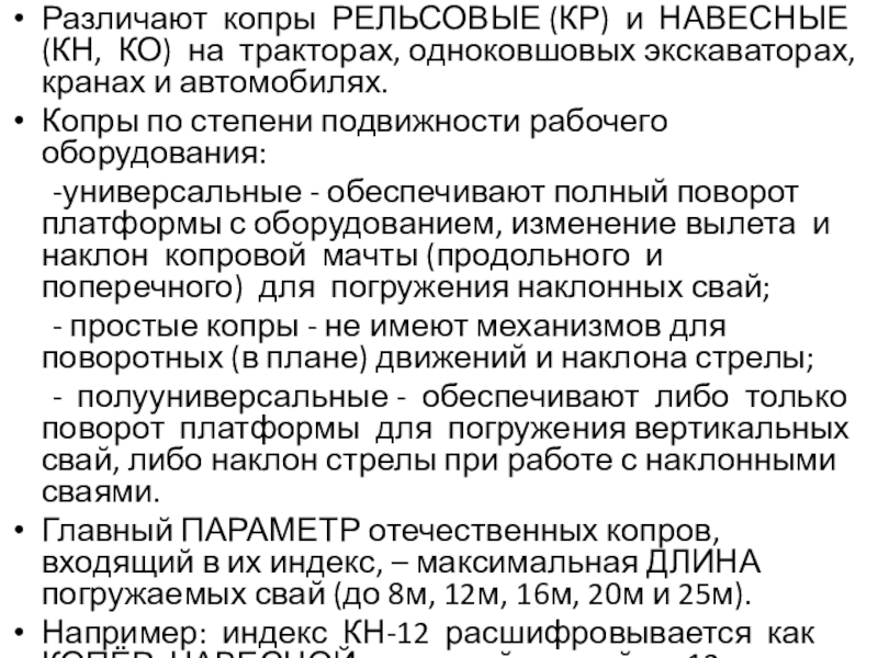 Слайд 3Различают копры РЕЛЬСОВЫЕ (КР) и НАВЕСНЫЕ (КН, КО) на тракторах, одноковшовых