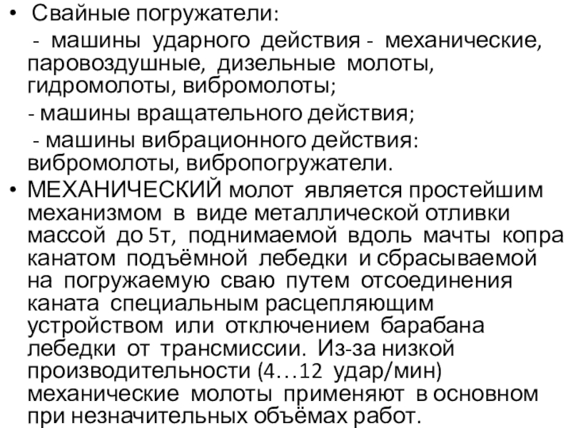 МЕХАНИЧЕСКИЙ молот является простейшим механизмом в виде металлической отливки массой до 5т, поднимаемой вдоль мачты копра канатом подъёмной лебедки и сбрасываемой на погружаемую сваю путем отсоединения каната специальным расцепляющим устройством или отключением барабана лебедки от трансмиссии. Из-за низкой производительности (4…12 удар/мин) механические молоты применяют в основном при незначительных объёмах работ.