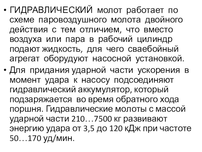 Для придания ударной части ускорения в момент удара к насосу подсоединяют гидравлический аккумулятор, который подзаряжается во время обратного хода поршня. Гидравлические молоты с массой ударной части 210…7500 кг развивают энергию удара от 3,5 до 120 кДж при частоте 50…170 уд/мин.