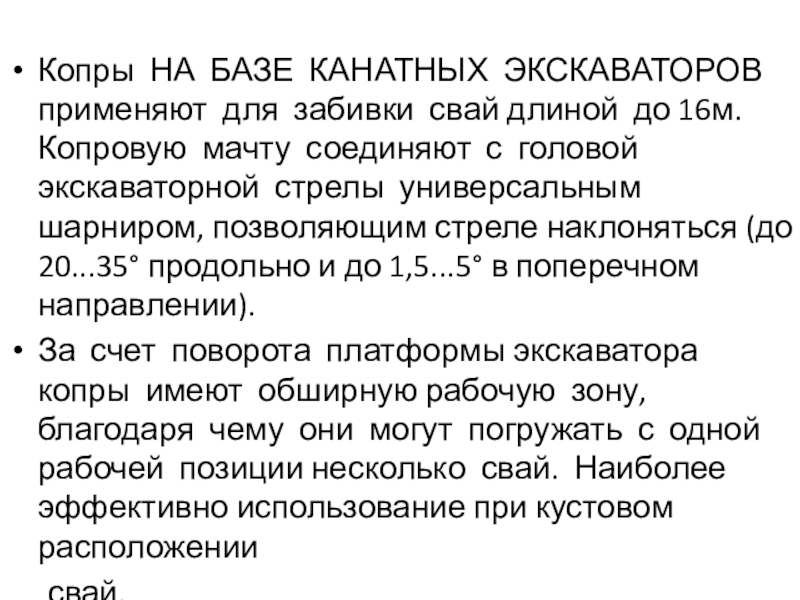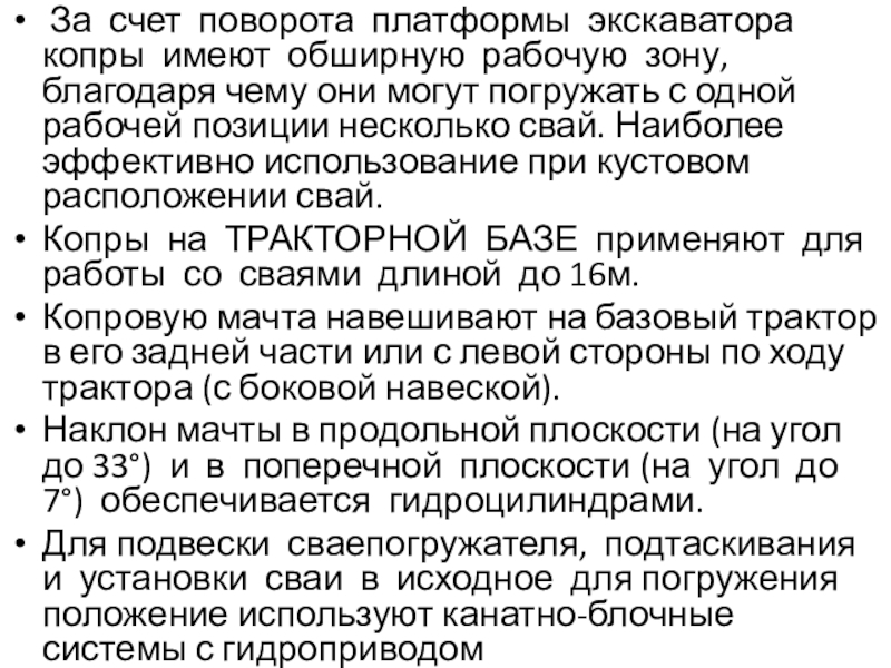 Слайд 8 За счет поворота платформы экскаватора копры имеют обширную рабочую зону,