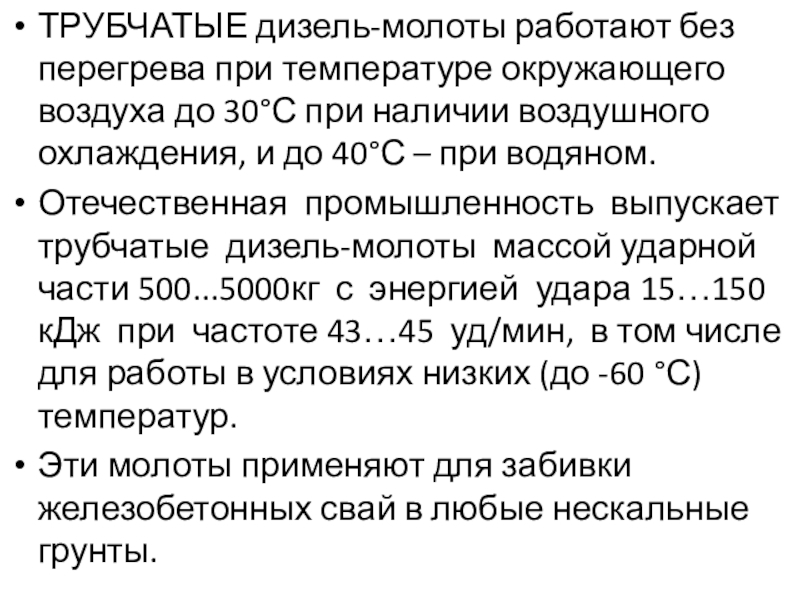 Слайд 22ТРУБЧАТЫЕ дизель-молоты работают без перегрева при температуре окружающего воздуха до 30°С