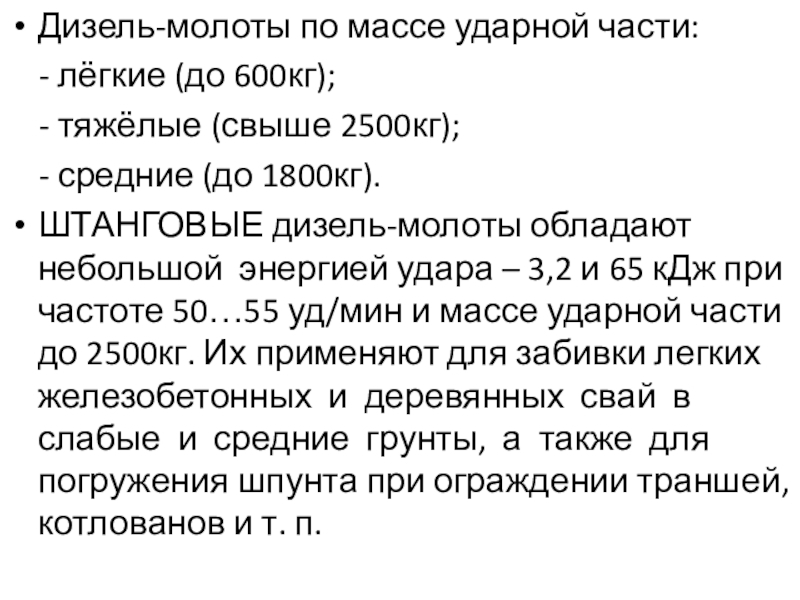 ШТАНГОВЫЕ дизель-молоты обладают небольшой энергией удара – 3,2 и 65 кДж при частоте 50…55 уд/мин и массе ударной части до 2500кг. Их применяют для забивки легких железобетонных и деревянных свай в слабые и средние грунты, а также для погружения шпунта при ограждении траншей, котлованов и т. п.