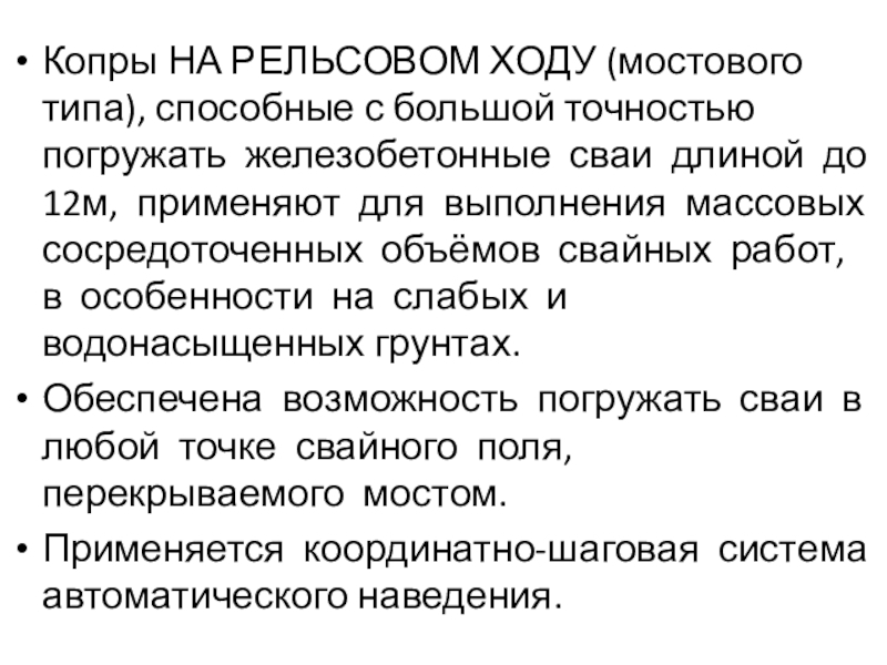 Слайд 6Копры НА РЕЛЬСОВОМ ХОДУ (мостового типа), способные с большой точностью погружать