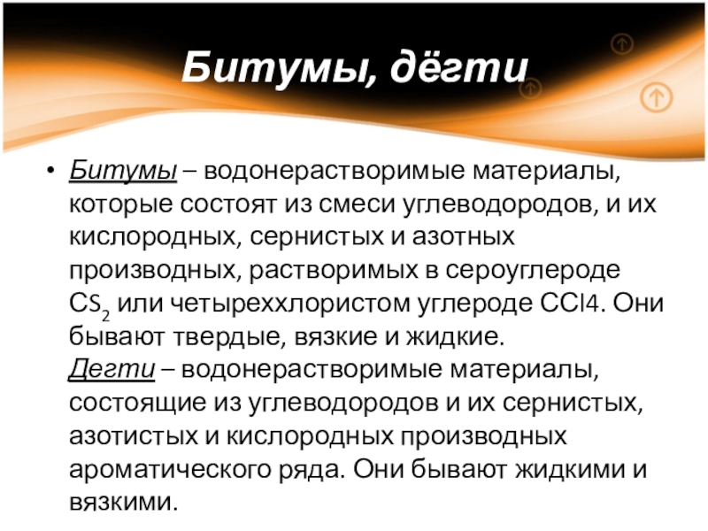 кислородных, сернистых и азотных производных, растворимых в сероуглероде СS2 или четыреххлористом углероде ССl4. Они бывают твердые, вязкие и жидкие.