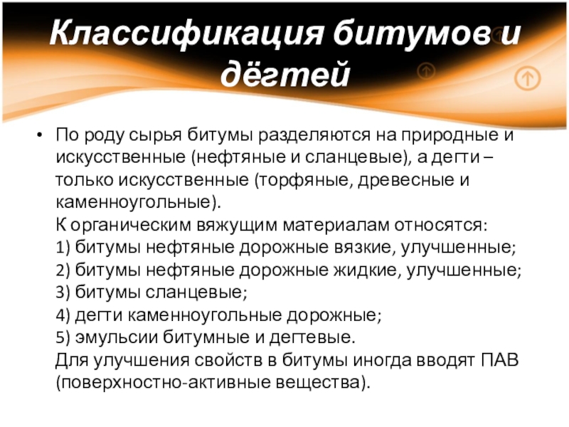В зависимости от происхождения, химического и вещественного состава органические вяжущие делят на следующие группы: