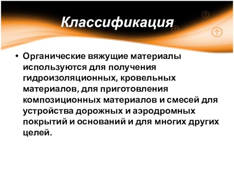 Органические вяжущие материалы используются для получения гидроизоляционных, кровельных материалов, для приготовления