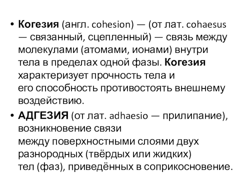 молекулами (атомами, ионами) внутри тела в пределах одной фазы. Когезия характеризует прочность тела и его способность противостоять внешнему воздействию.