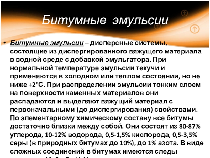 водной среде с добавкой эмульгатора. При нормальной температуре эмульсии текучи и применяются в холодном или теплом состоянии, но не ниже +2oС. При распределении эмульсии тонким слоем на поверхности каменных материалов они распадаются и выделяют вяжущий материал с первоначальными (до диспергирования) свойствами. По элементарному химическому составу все битумы достаточно близки между собой. Они состоят из 80-87% углерода, 10-12% водорода, 0,5-1,5% кислорода, 0,5-3,5% серы (в природных битумах до 10%), до 1% азота. В виде сложных соединений в битумах имеются следы металлов Ni, Co, Fe, U, V.